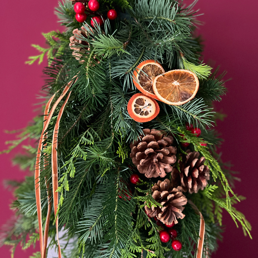 Festive Bloom Tree is a luxurious Christmas statement arrangement designed in an elegant hat box, featuring two types of premium festive foliage including lush mixed evergreens and fragrant cypress, adorned with decorative berries, oranges, pinecones and finished with a soft velvet ribbon for a refined festive touch. Measuring approximately 60 cm in height and 30–35 cm in width, this piece is perfect for entry tables, sideboards or as a striking Christmas gift.